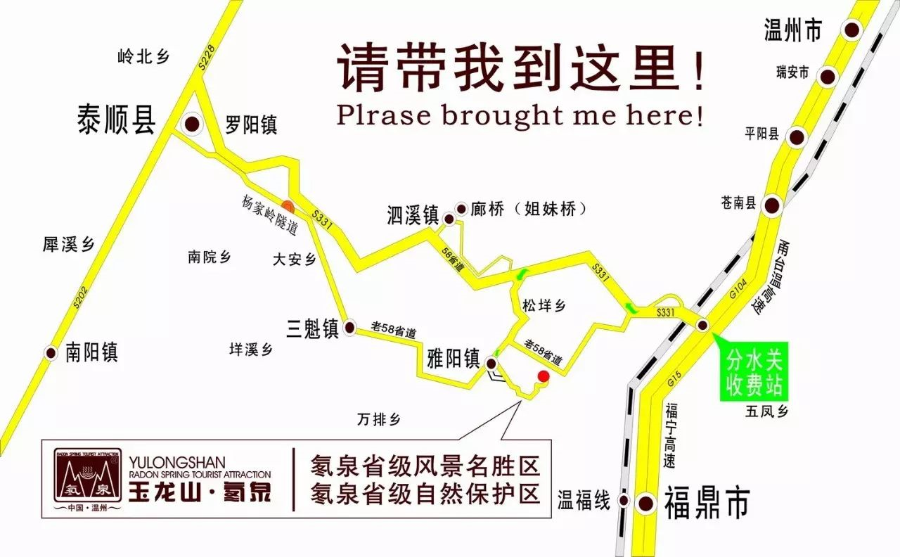 2、苍南、平阳出发:县城——至分水关出口——泰顺线——往雅阳镇方向——到达玉龙山氡泉景区